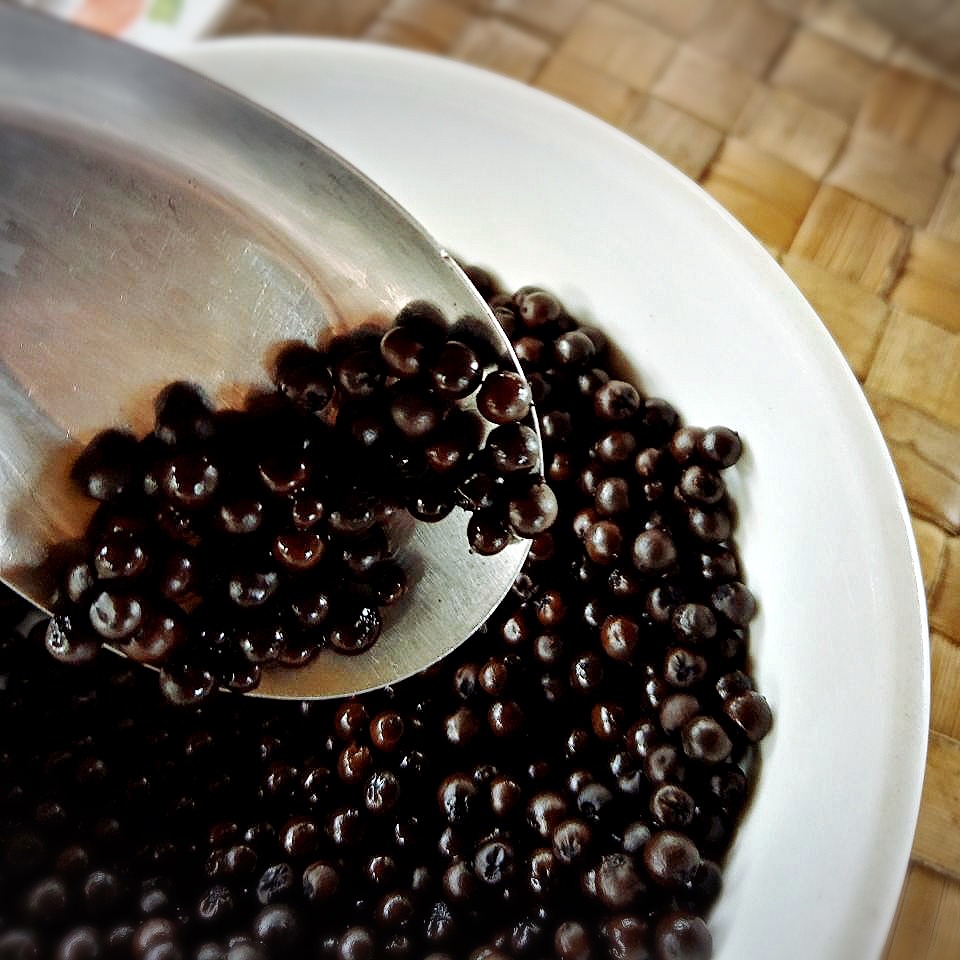 1. セミドライペッパーを茶こしなど、目の細かいザルに食べる分だけ入れる。
